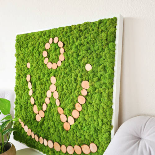 Es muss nicht immer ein Logo aus Moos sein. Für unsere pflegeleichten Moosprodukte nutzen wir gern jegliche Naturmaterialien. So können wir Dein Logo/ deinen Slogan auch aus kleinen Astscheiben gestalten. Als Basis dafür eignet sich besonders flaches Waldmoos oder Islandmoos, welches zudem in verschiedenen Farben erhältlich ist.