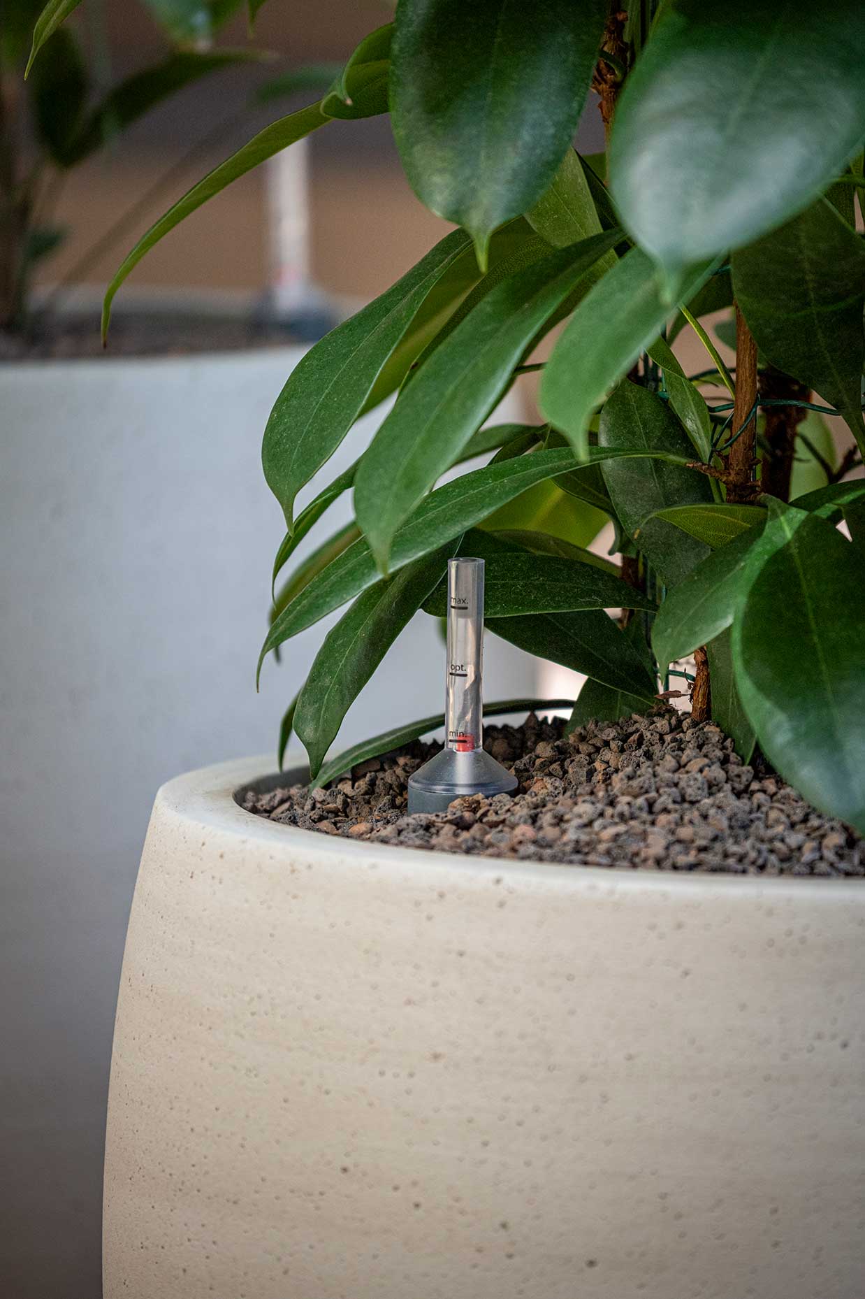 Optische Highlights - pflegeleicht & modern Hydropflanzen zeichnen sich durch ihre geringe Pflegeintensität aus. Dank des integrierten Wasserstandsanzeigers ist immer genau sichtbar, wann die Pflanze Wasser braucht. So eignen sich Hydropflanzen perfekt für Büros, Praxen, Hotels oder Wohnräume, in denen Sauberkeit und einfache Pflege gefragt sind. Sie verbessern das Raumklima, steigern das Wohlbefinden und schaffen eine Atmosphäre, die Ruhe und Eleganz ausstrahlt.