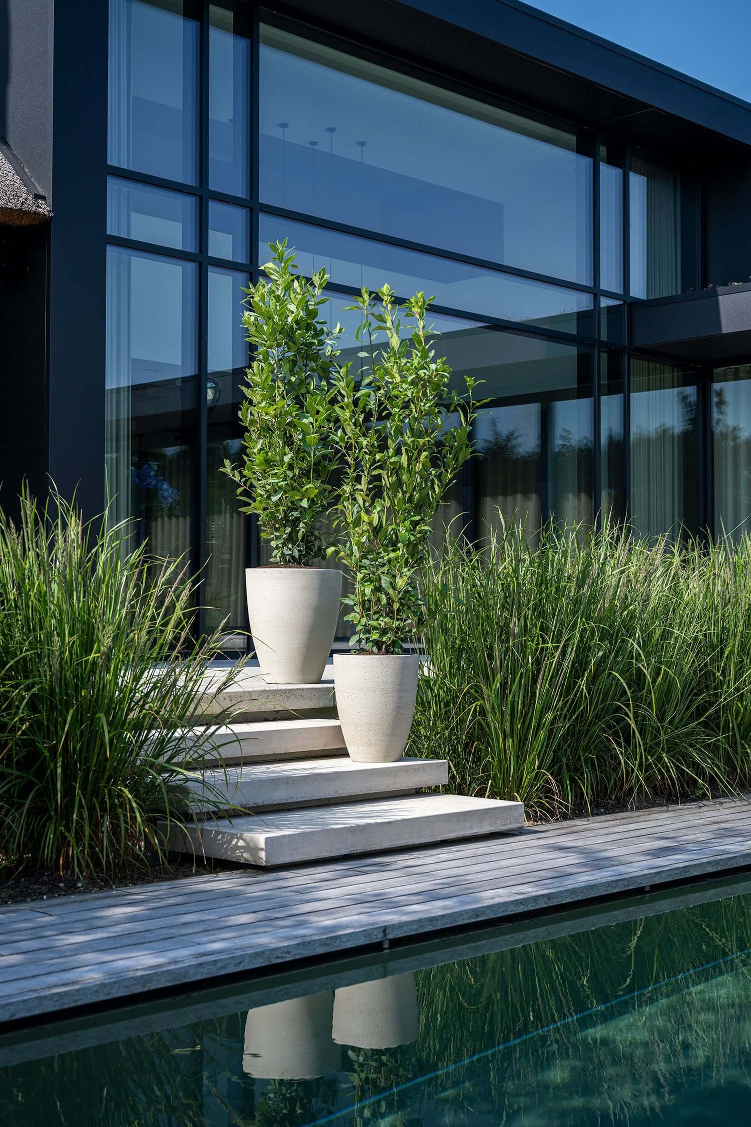 liebevolle ausgewählte Pflanzenarrangements in stilvollen Outdoorgefäßen
