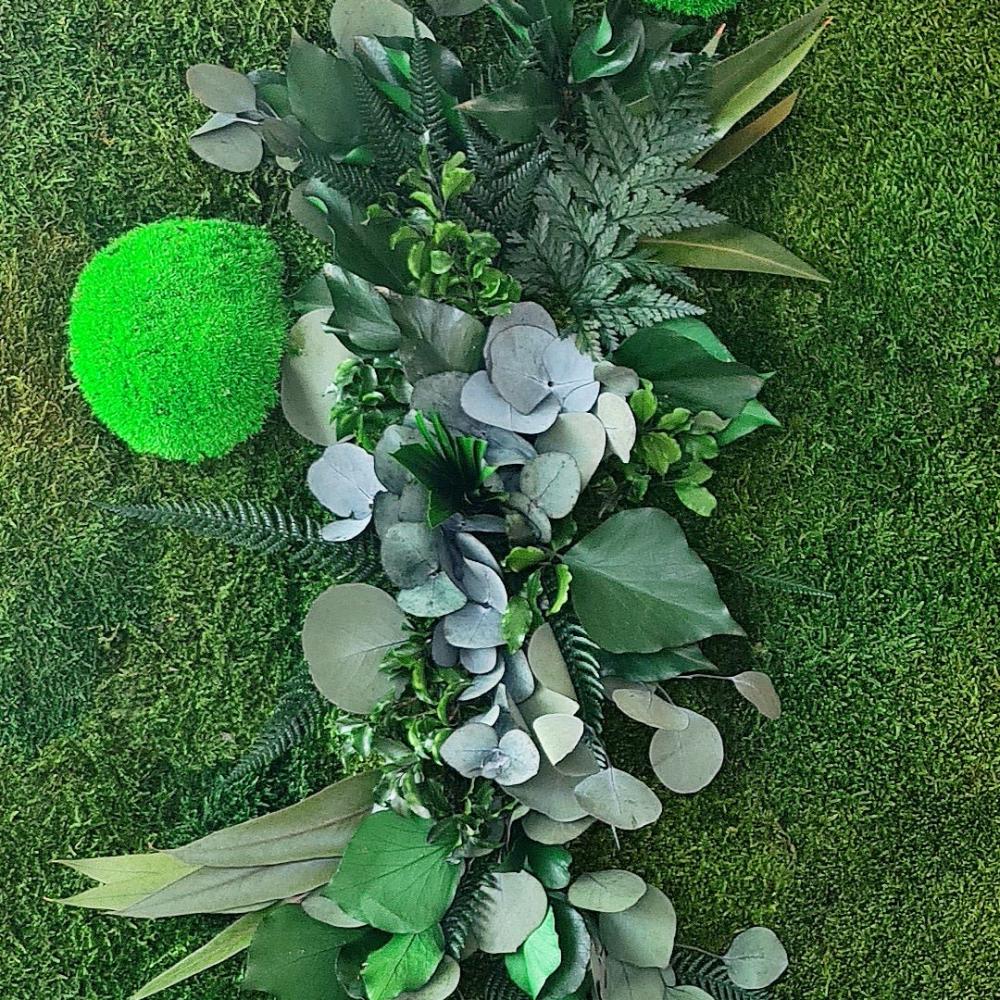 Pflanzeninseln aus Farnen, Eukalyptus und weiteren natürlich konservierten Pflanzen und Blumen bilden auf einem Untergrund aus flachem Waldmoos mit einzelnen Kugelmoosakzenten optische Highlights. Logos oder Slogans können auch hier perfekt in Szene gesetzt werden.