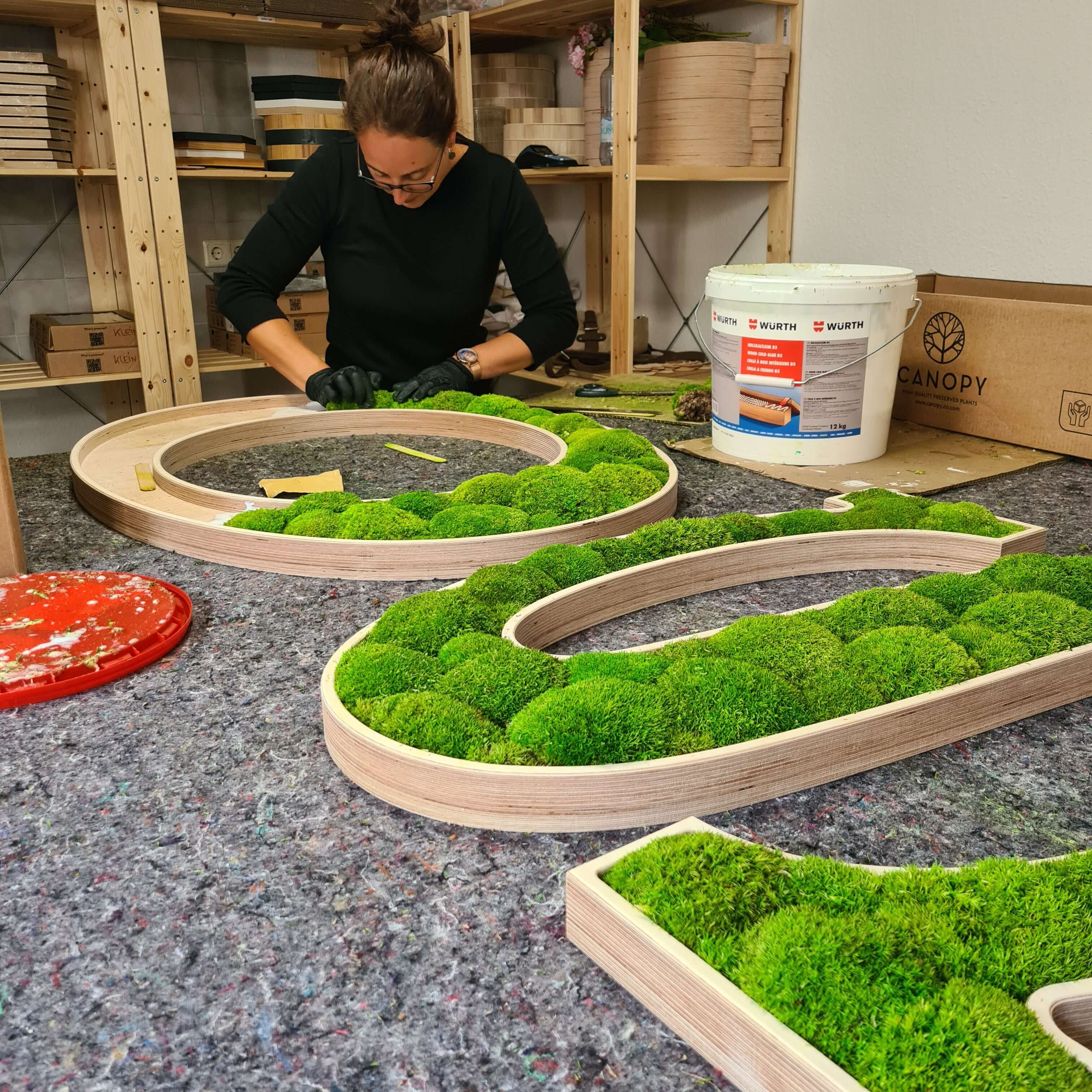 In unserer Werkstatt in Walldorf fertigen wir individuelle Mooswände und Moosbilder auf Maß mit Moos und Pflanzen. Wir integrieren dein Firmenlogo in Dein Moosbild oder gestalten Dein Logo ganz aus Moos.